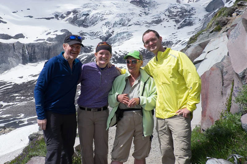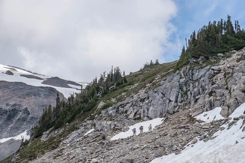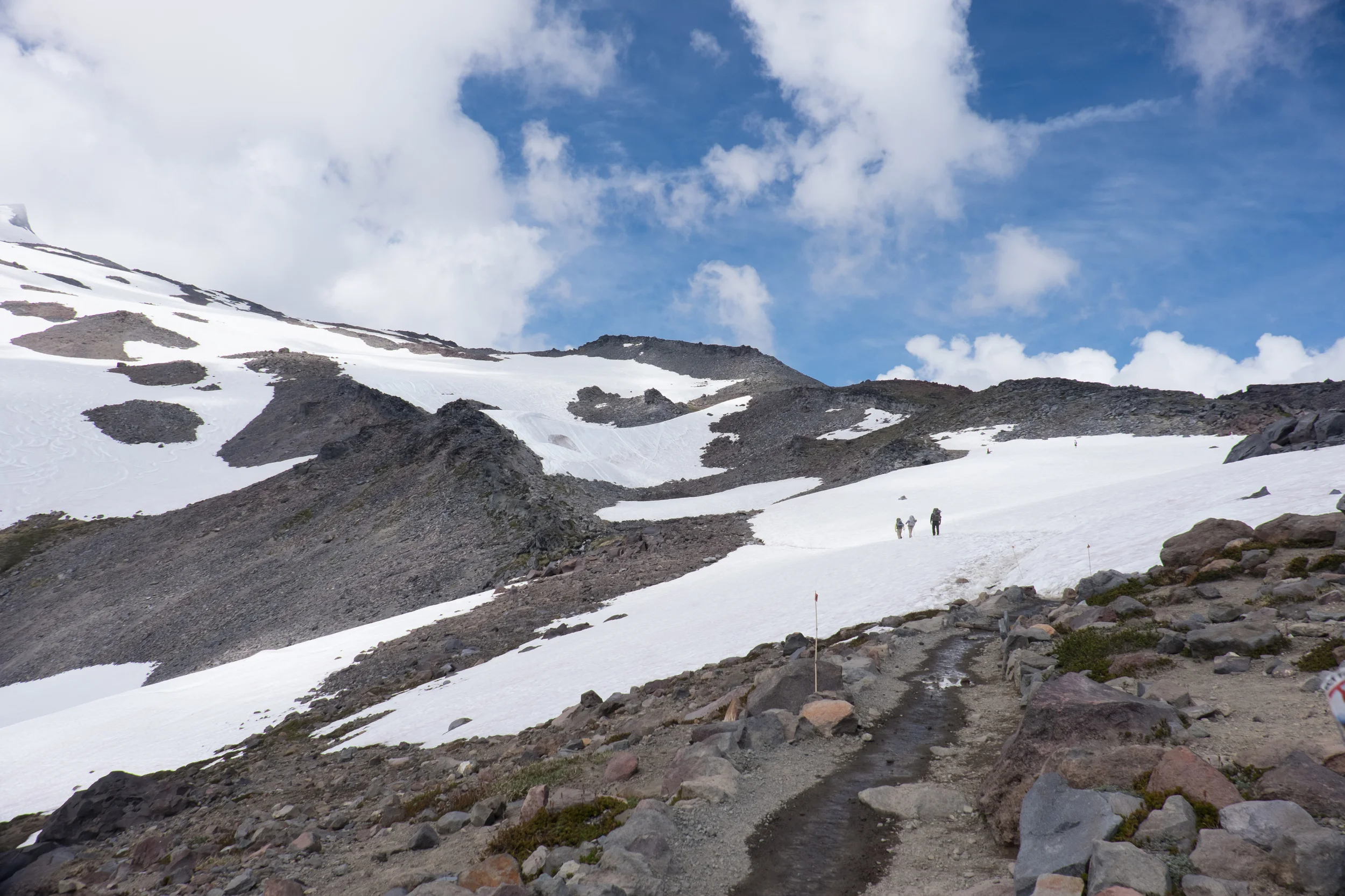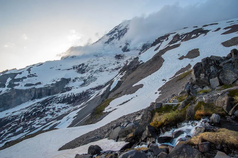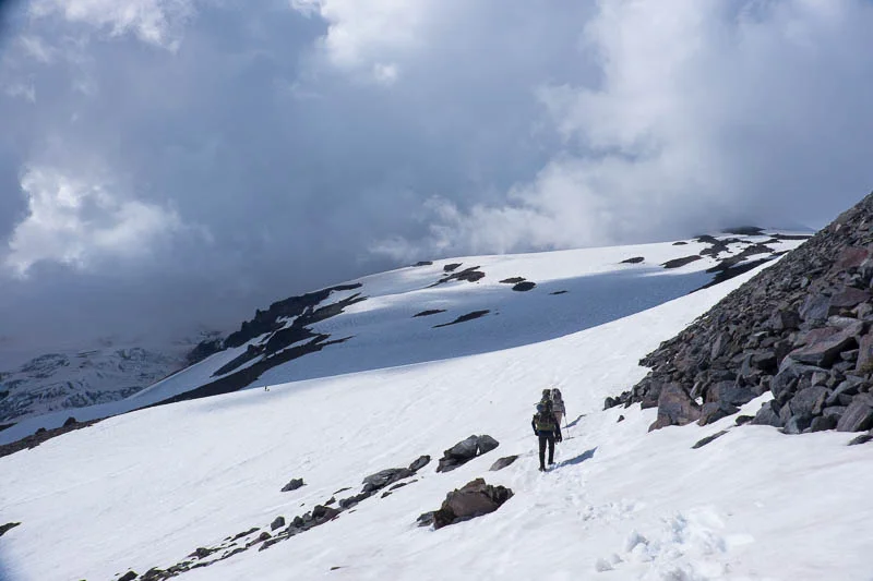 The quality of the air and the view, and the disbelief of finding myself hiking up the side of such an iconic mountain was head-spinning. As stone stairs slowly and finally turned into snowfield, we all paused for a drink and a quick lunch. Looking up the mountain, afternoon clouds had rolled in, completely obscuring our view of Camp Muir. But we were making spectacular time, and also, having a spectacular time.