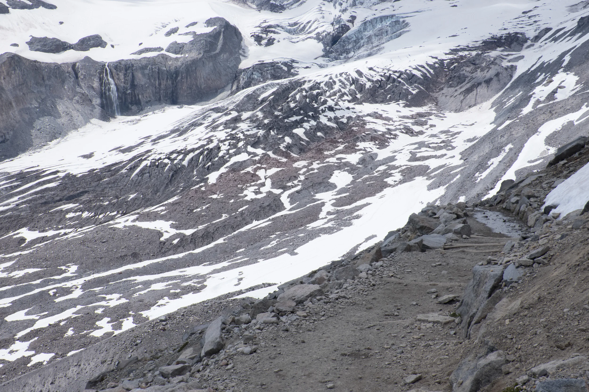 Miles across the valley, on the another foot of the mountain, we heard the roar of a glacial waterfall, and the occasional thunder-clap of calving glaciers. We walked through glacial streams ourselves, often seeing the rushing water enter on one side of the snow patch we stood on and exit on the other.