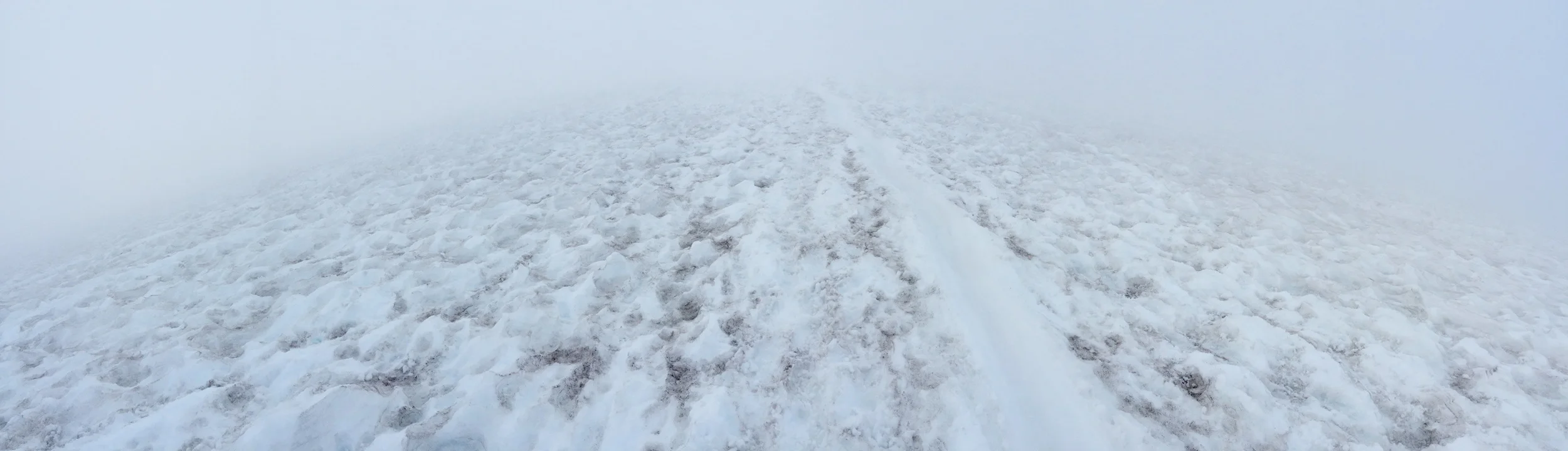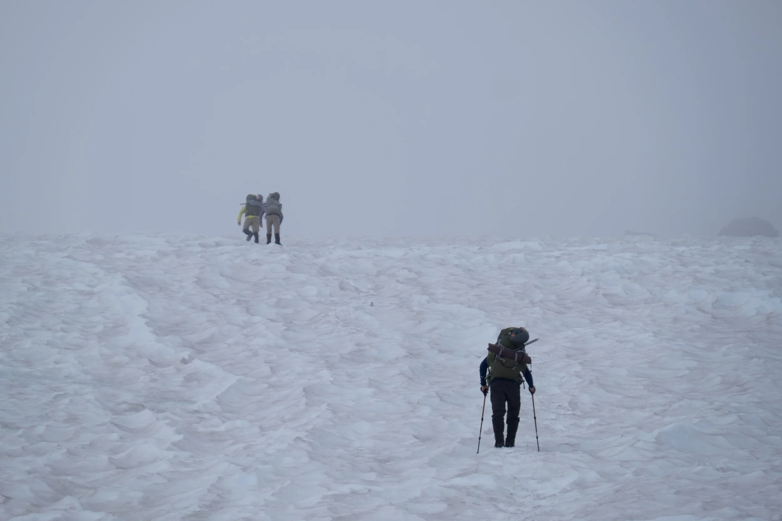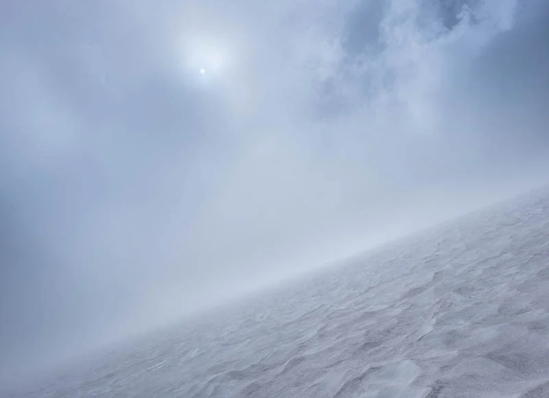 We looked forward to the task ahead and saw skiers on their way out of the cloud, on down the mountain. It would be a quick and easy trip down, sitting on my snow pants and glissading down the well-worn butt paths. It was still mid-afternoon with lots of time until prime photography light. I made a deal with myself to be headed down by 6:30pm, to allow for a good hour or two of descending stone stairs to get me where I wanted to be for sundown.