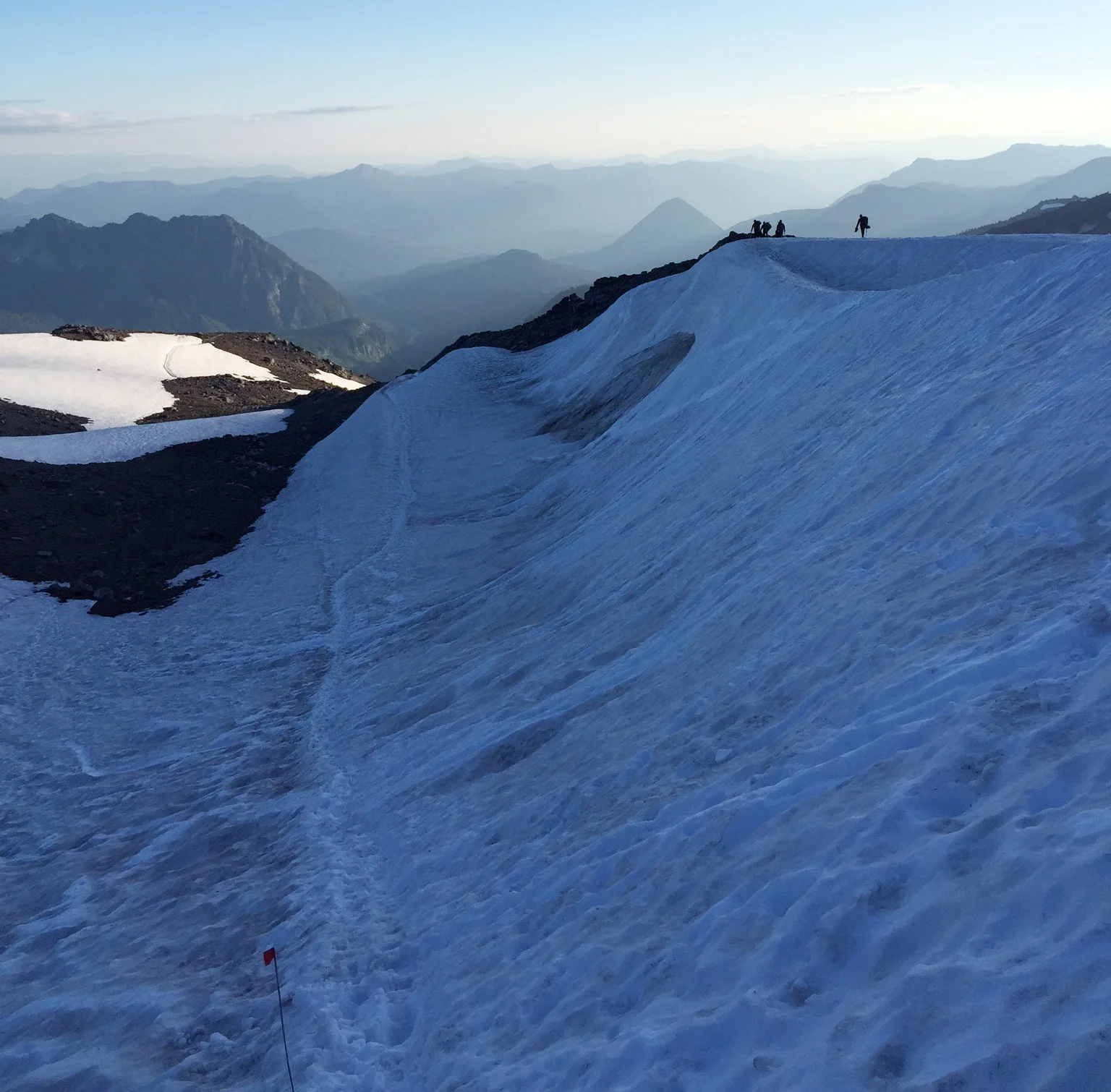 The fourth or fifth stretch destroyed me. My right boot (hastily waterproofed not 48 hours prior), began to leak because I was toeing in hard into the snow field with each step to gain traction. And traction was still very hard to come by. I could rarely see Josh, Lindsay, and Dave. I caught a few glimpses of Dave, and could see that I was about 50 yards back. In my 40-yard circle on the side of Mt. Rainier, I was alone. It was 6:05, but surely, I thought, the Camp Muir was at the top of this ridge. One after another. Surely this next ridge. 6:30 came and passed, and at about 6:40, I ran out of water. I hadn’t prepared well enough to press on.