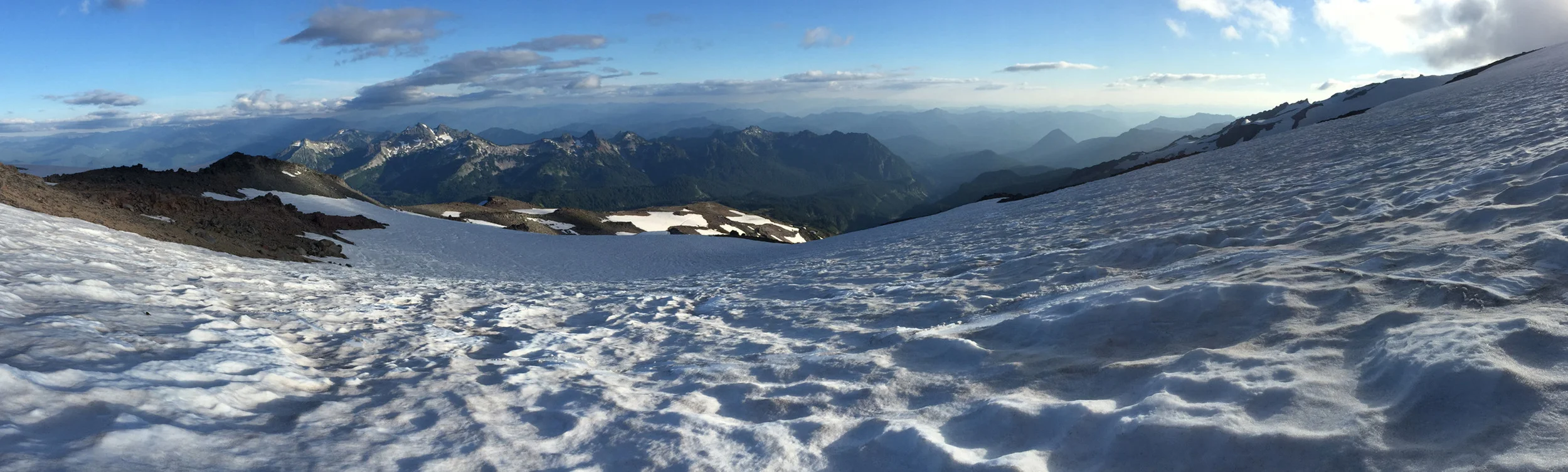 So, it was time to turn around. No destination having been reached, I marked my spot with photographs, put my camera away, I put my rain fly on my backpack, tightened my snow pants, sat down in one of the glissade paths I was hewing close to, shortened my trekking poles, and pushed off. After a few fits and starts (and the shock of cold under, around, and between my legs), the path down was unbridled enjoyment. Perfect views of the rest of the park, the long trail up, and Mt. Adams in the far distance emerged out of the clouds as I slid down the snowfield. A group of four hikers who had summited earlier that day quickly approached from behind, riding fast on slick, large, garbage bags. We paused and talked, and learned that I was right… Camp Muir was just at the top of that last bit.